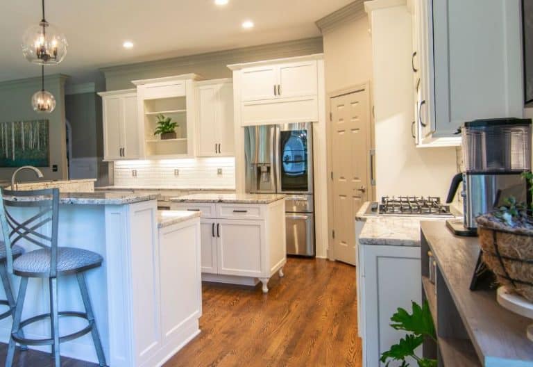 Resurfacing the cabinetry along the walls as well as the siding of the freestanding island in a bright, clean, refreshing, and crisp white allows the space to look bigger.